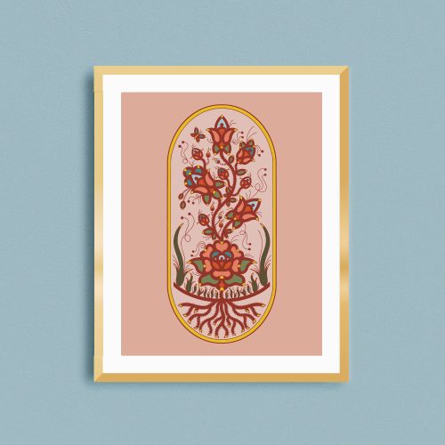 Drawn in Janelle’s signature art style, Stained Glass Michif, a creative interpretation of traditional Métis beadwork and stained glass.